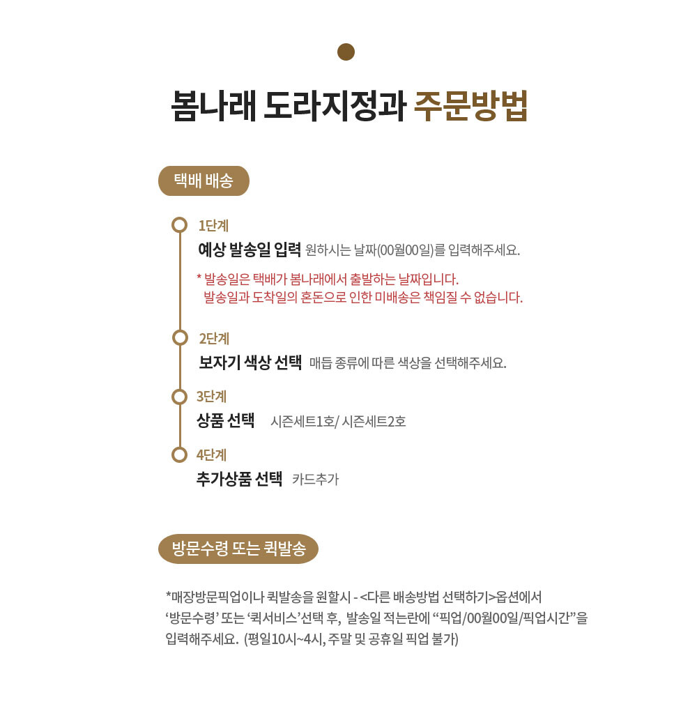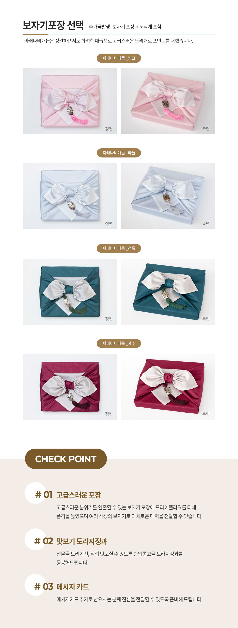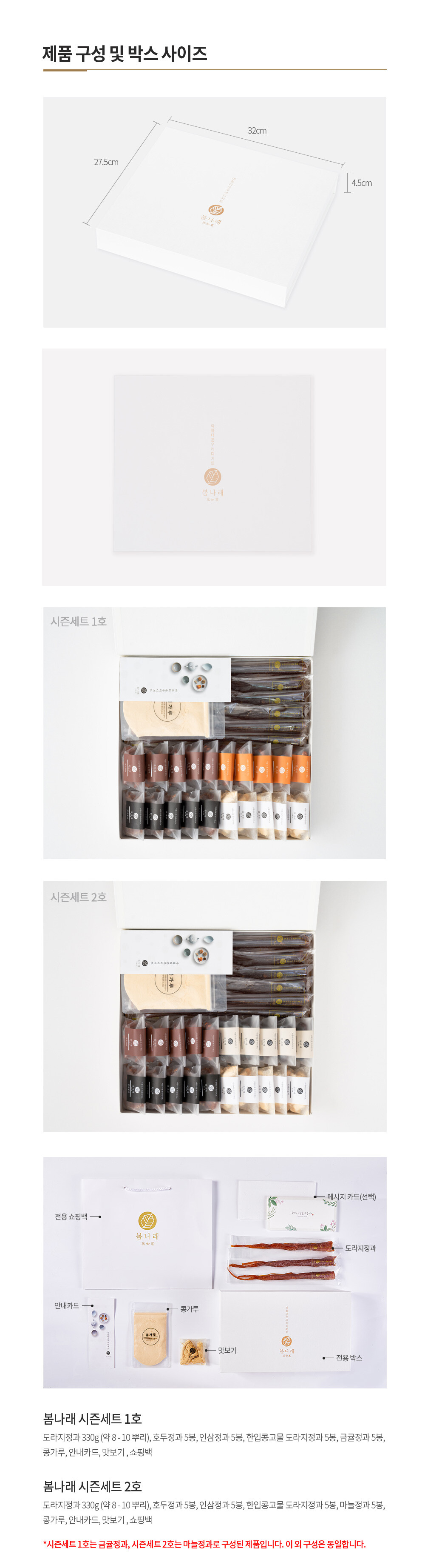 상견례 선물과 중요한 분들께 드리는 선물로 많이 준비하시는 제품입니다. 봄나래 시그니처 메뉴들에 시즌에 따라 금귤정과 혹은 마늘정과가 더해진 구성으로 한 박스안에 작은 사계절을 담아 놓은 제품입니다.